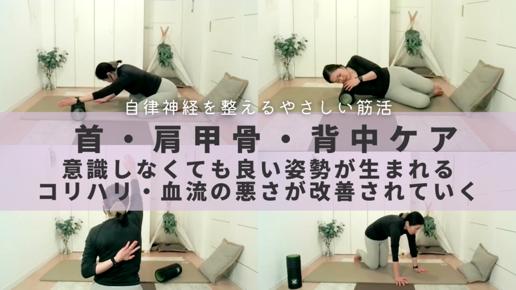 【ほぐす+動かす+ストレッチ】休んでいた筋肉と、使われ過ぎ硬くなった筋肉をチェンジする。交感神経の緊張・コリハリ・巻き肩・ストレートネック・デコルテラインの崩れ・猫背・肩の盛り上がり・脇や二の腕のたるみ・目の疲れ・頭痛改善に。