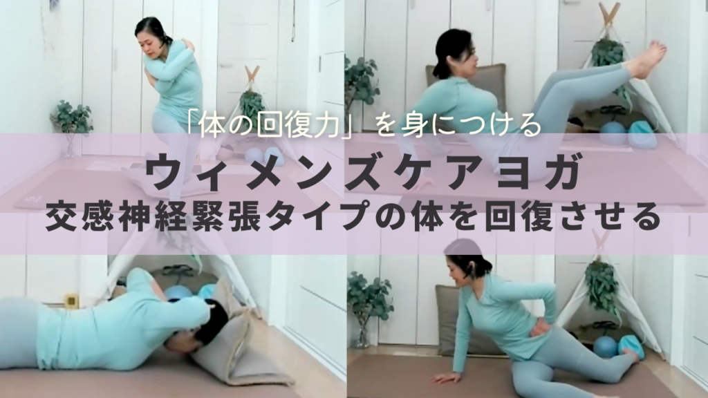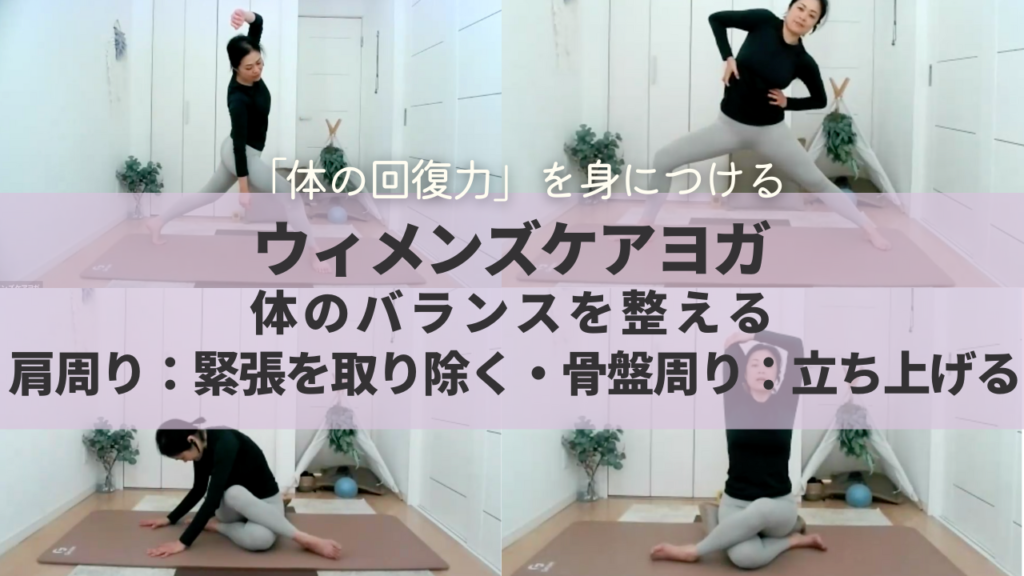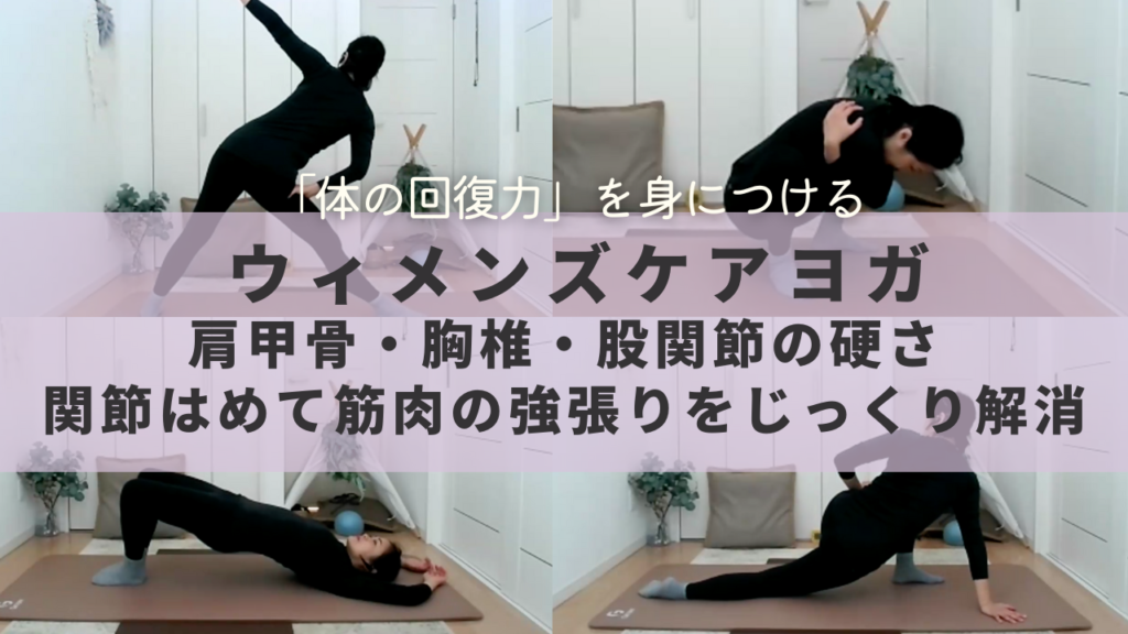 ストレスリラクゼーションテクニックで、楽になった体を定着させていく。女性の体調に大切な自律神経バランスを取り戻すヨガ。首・肩甲骨周り・股関節・お尻などコリハリやすい箇所をほぐし、コリハリにくい筋肉の質を育てる。