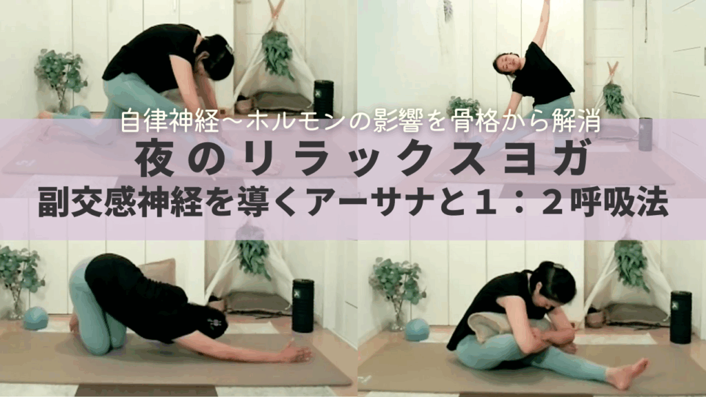 背中や腹部の筋をゆるめるアーサナと、1:2呼吸法を組み合わせた「神経系の切り替え(副交感神経↑)」を促進するヨガ。