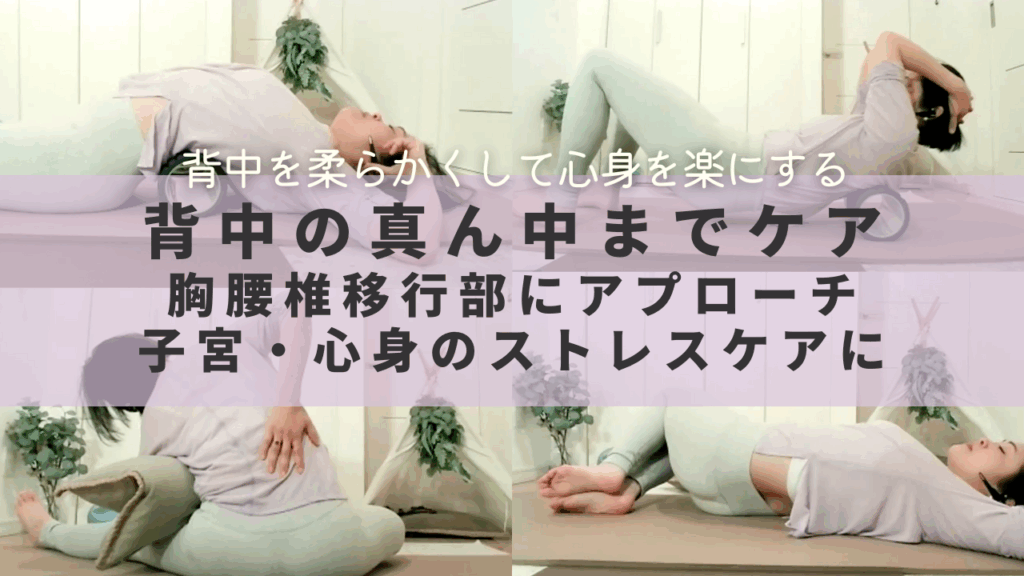 筋肉のコリが出やすい「胸腰椎移行部」を楽にしていく。関係する、恥骨周りの硬さへもアプローチ。骨盤内(臓器)の循環と心身のストレスを癒していく。