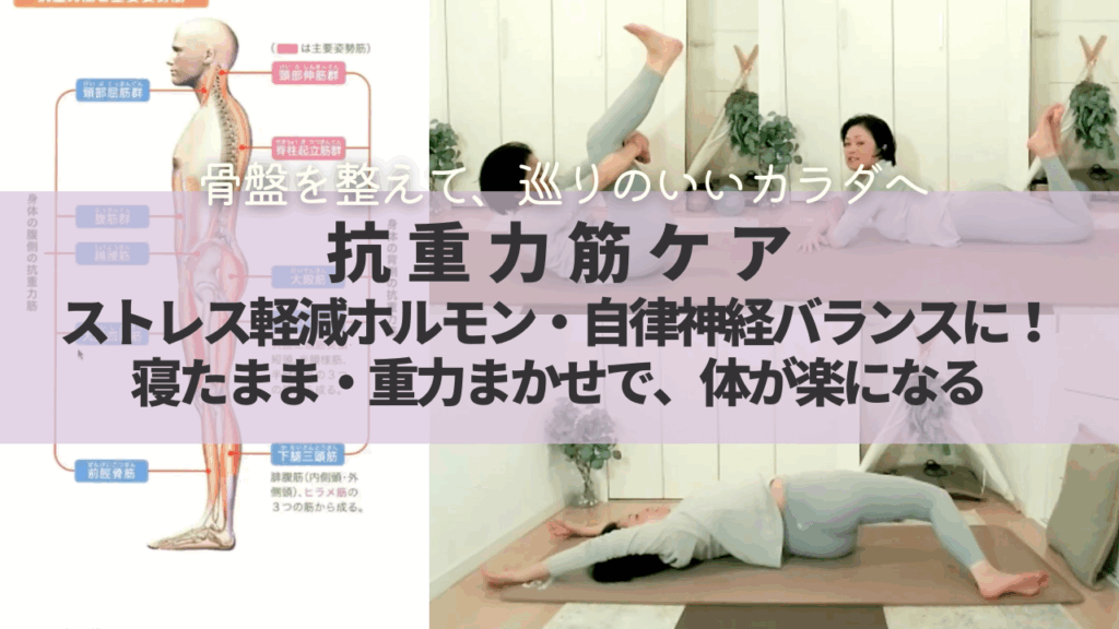 背中側が軽く・骨盤が立ち上がる・呼吸が広がる・血流が良くなる=自律神経バランス良好へ。背中側の疲れ・骨盤が立たないももの付け根の縮み・膨らむお腹…女性特有の体の辛さは体にかかる重力負担にある。気になる骨盤底・内臓(膣)下垂・お腹の冷え・生理痛・PMS・生理中の重さに。