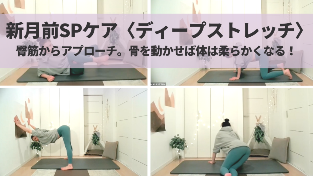 〈新月前ケア〉足までポカポカ血が巡る。体が硬くても柔らかくなる。硬いところには贅肉が・・・お尻から変えていく骨を動かすストレッチ。