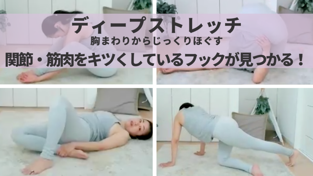 いっぱいストレッチしたい!な時に。胸周りからじっくりほぐすディープストレッチ。体を硬くしている原因フックが見つかって取り除いていける。腰痛・呼吸しづらい・首がきつい・背面がキツイ・浮腫・腕の痺れ、対応回。