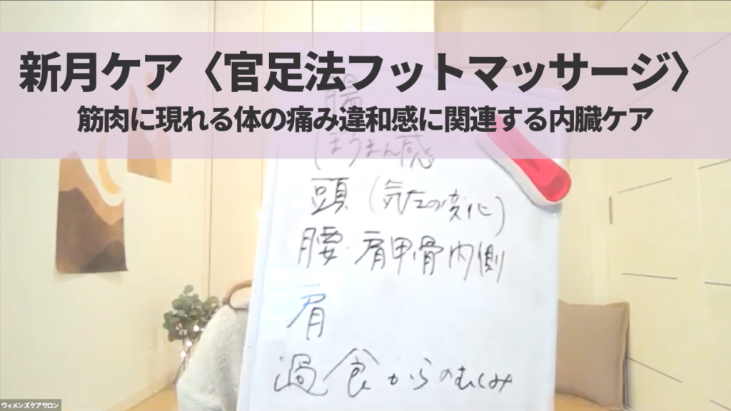 〈新月ケア〉官足法フットマッサージ。腎・肝臓・膀胱・子宮・胃腸・自律神経。筋肉に現れる痛み不快感につながる内臓のケア。〈新月ケア〉